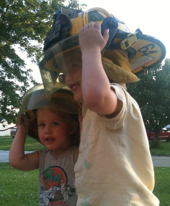 I’m in awe. I just got back to the firehouse. Your mom brought the three of you…SD, NE and SI…to the station this afternoon to visit me on my second day of a 48 hour shift, and while you were here, we were dispatched to a motor vehicle crash on the highway. You had been here about 20 minutes, climbing all over the ladder truck as usual…playing firemen…wearing my boots and my helmet. When you wear my helmet, it’s so heavy on your little head that when it’s sized for me, not you, it falls down over your forehead, covering your eyes…so you winch it down to your size, so it fits.